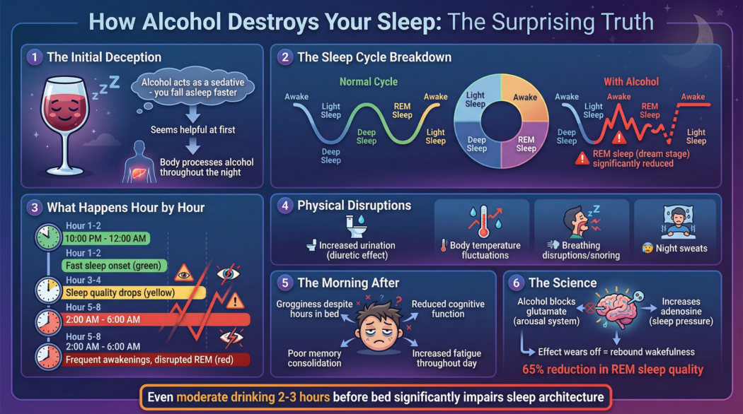 Alcohol’s impact on sleep isn’t a simple case of “it makes you sleepy, so it helps you sleep.” The reality is far more nuanced and involves multiple stages of the sleep cycle.