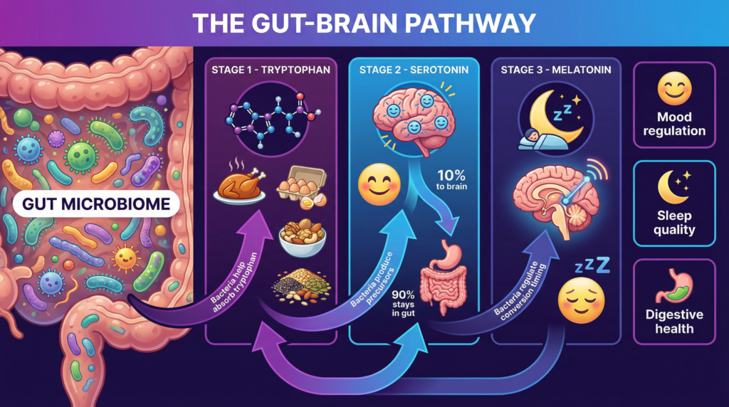 The relationship between gut bacteria, serotonin, and melatonin regulation represents a paradigm shift in sleep science. The gut microbiome is not merely associated with sleep — it actively shapes the biochemical pathways that govern circadian timing and sleep quality.