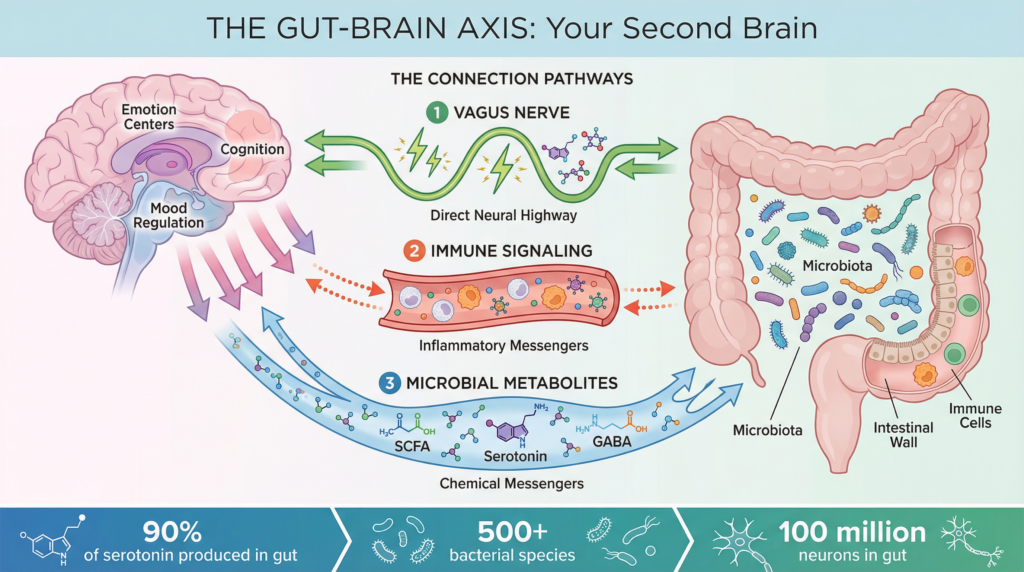 Stanford-published summaries highlight that gut microbes influence neurotransmitters, including serotonin, which affects mood, cognition, and sleep regulation (Stanford Medicine, 2025).