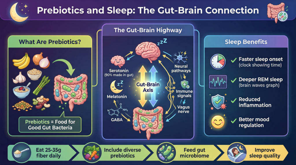 Want a broader view of how gut health influences sleep? This article focuses on prebiotics and dietary fiber, but these mechanisms are part of a larger gut–sleep relationship. Explore our in-depth guide on how gut health influences sleep and insomnia to understand the full biological context.