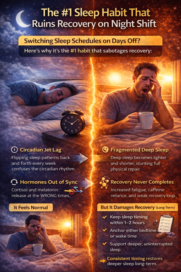 👉 The #1 sleep habit that ruins recovery on night shift is inconsistent sleep timing — especially on days off.