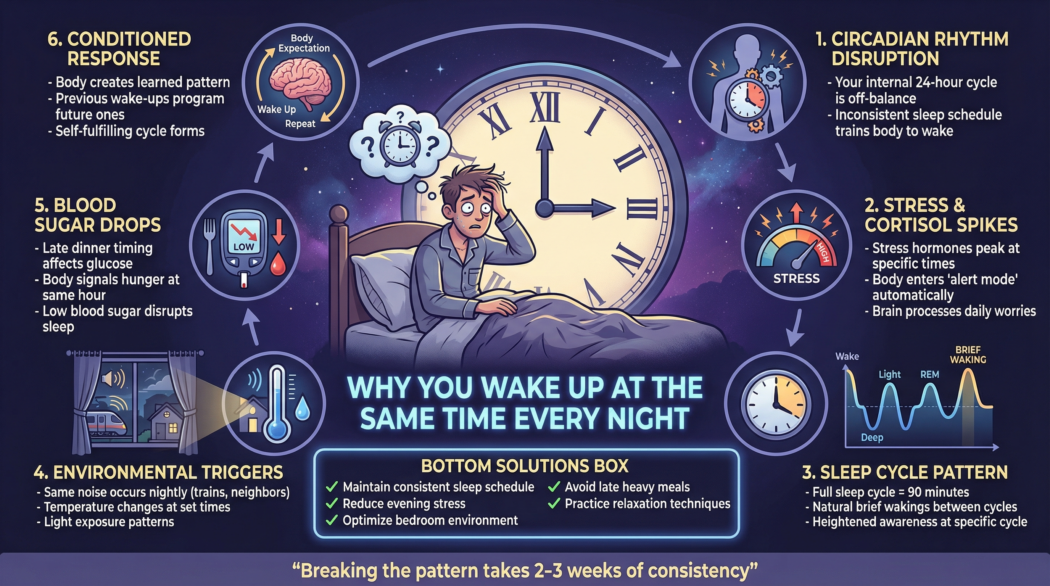 Most people wake up at the same time every night due to stress hormones (especially cortisol), dips in blood sugar, disrupted sleep cycles, or misalignment of the biological clock. These signals can trigger alertness even when you’re exhausted.